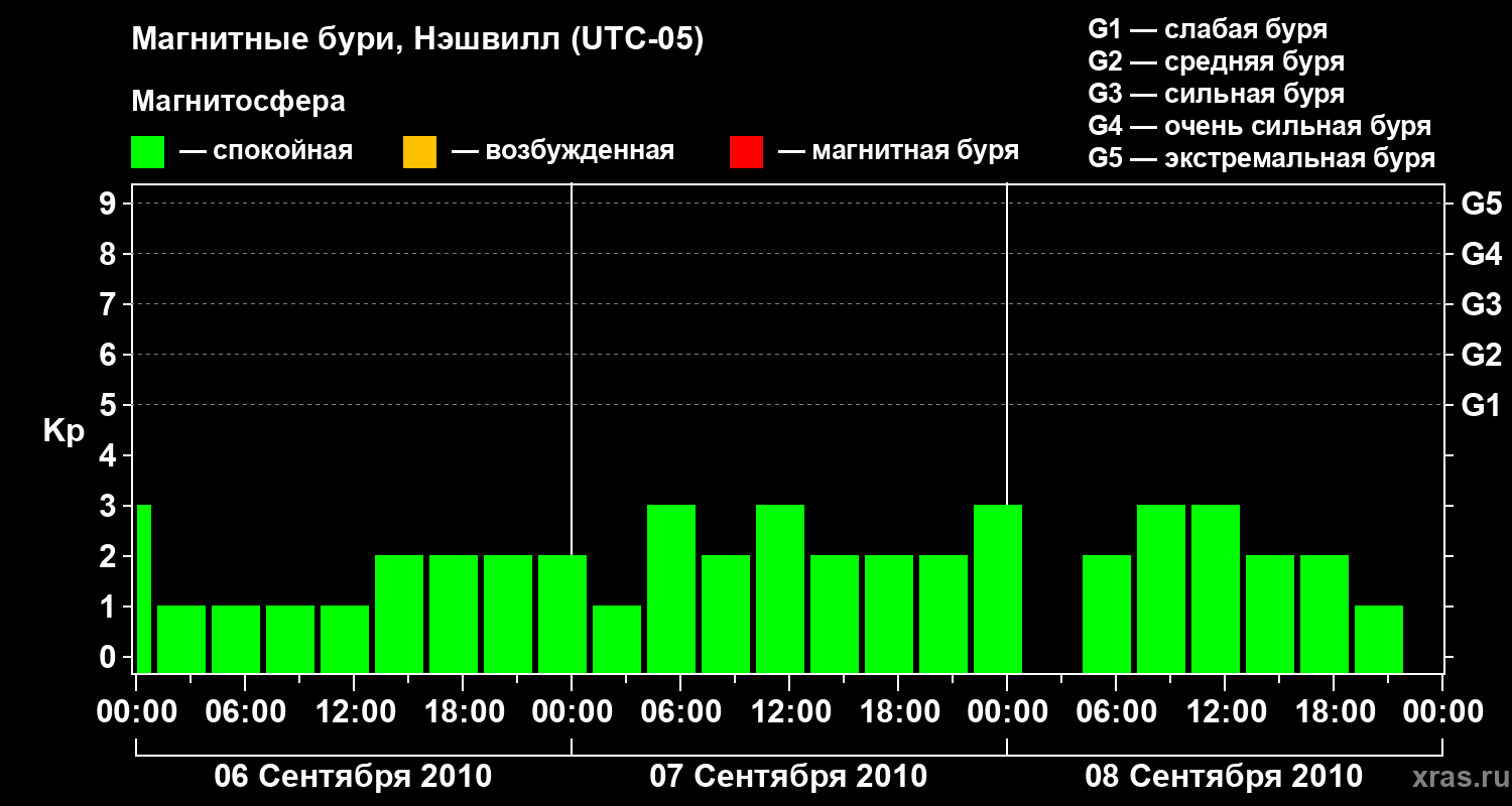 Изменения геомагнитного индекса Kp с 6 по 8 сентября 2010 года для средних широт