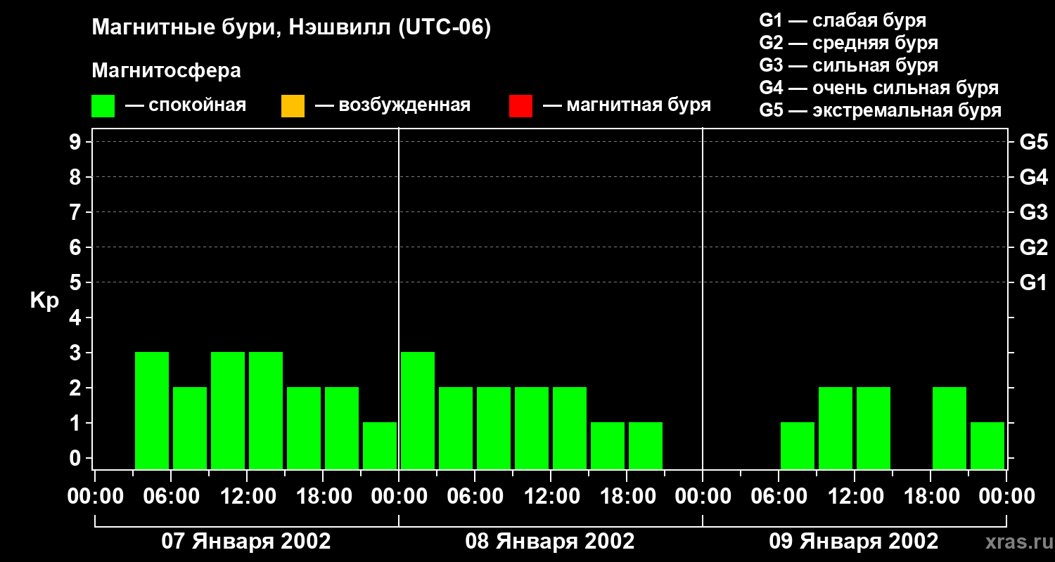Изменения геомагнитного индекса Kp с 7 по 9 января 2002 года для средних широт