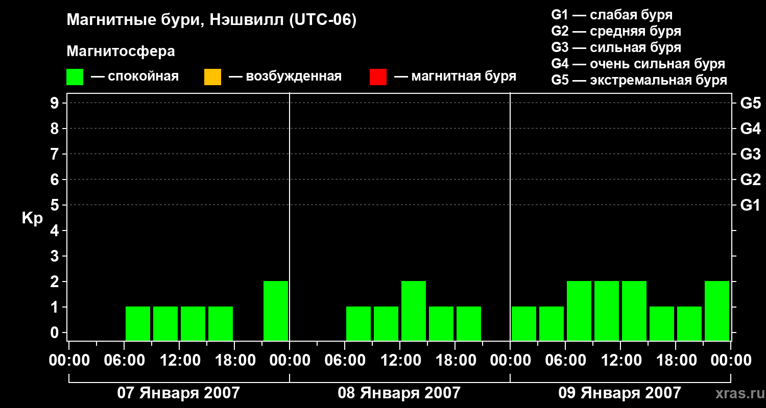 Изменения геомагнитного индекса Kp с 7 по 9 января 2007 года для средних широт