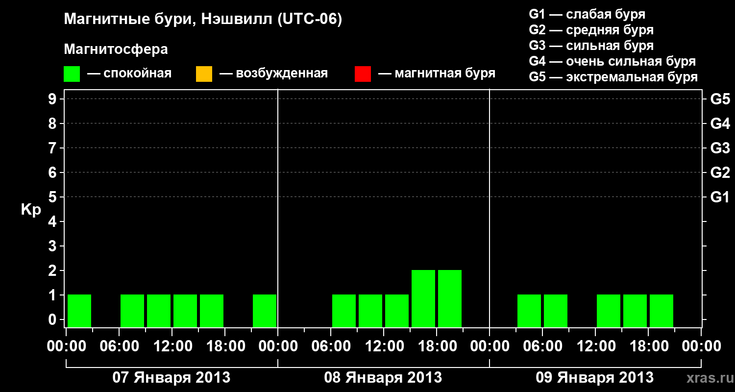 Изменения геомагнитного индекса Kp с 7 по 9 января 2013 года для средних широт