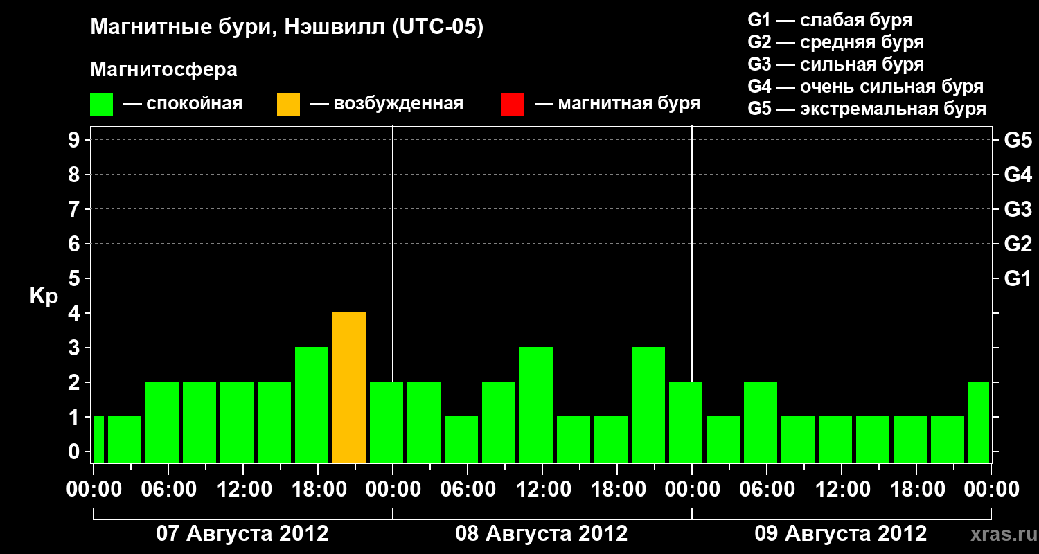 Изменения геомагнитного индекса Kp с 7 по 9 августа 2012 года для средних широт