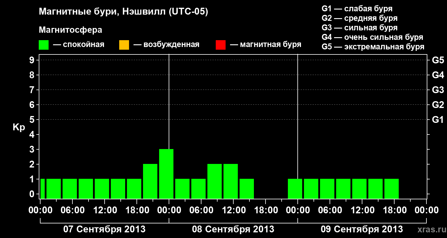 Изменения геомагнитного индекса Kp с 7 по 9 сентября 2013 года для средних широт