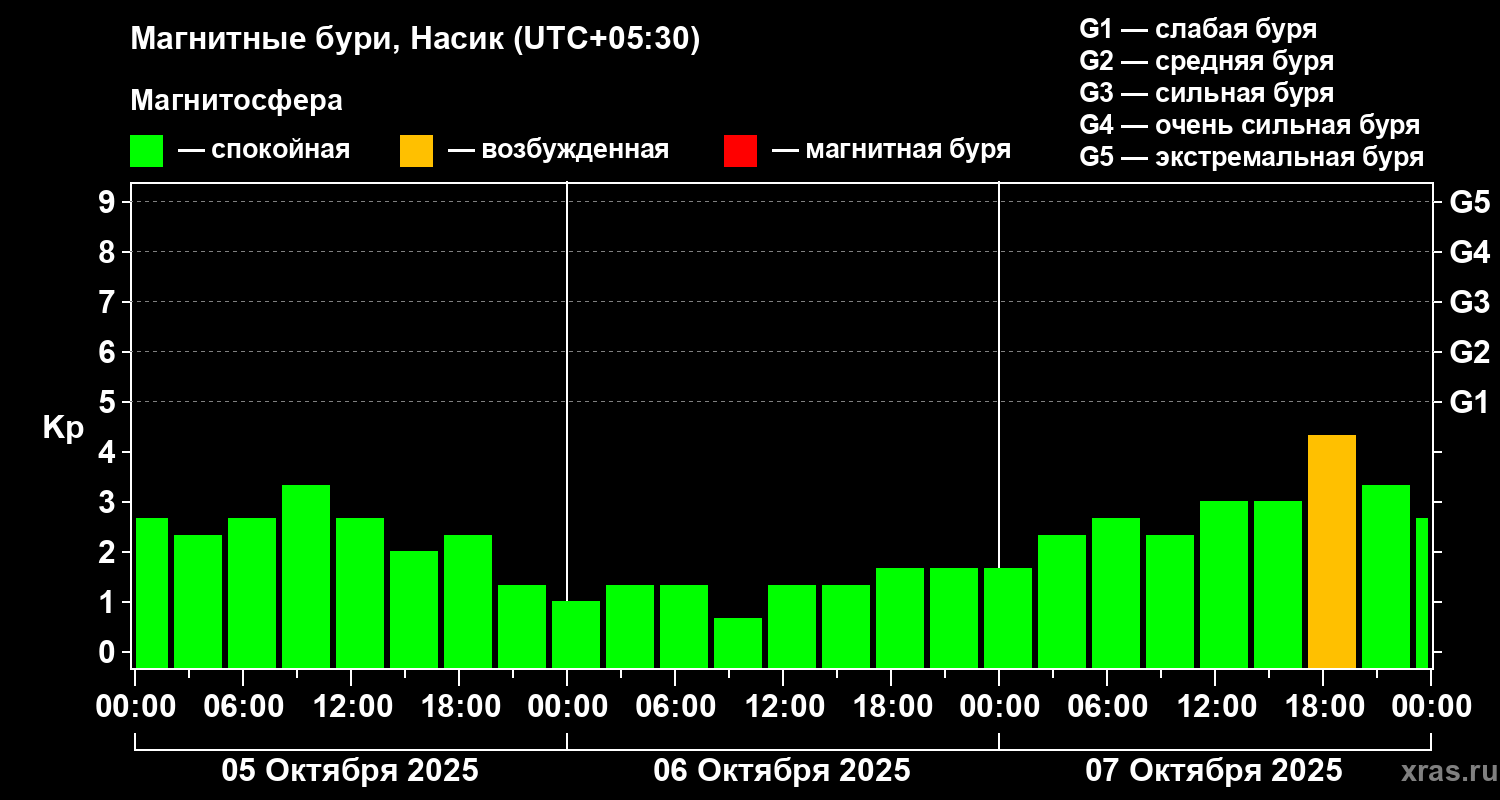 Изменения геомагнитного индекса Kp с 5 по 7 октября 2025 года для средних широт