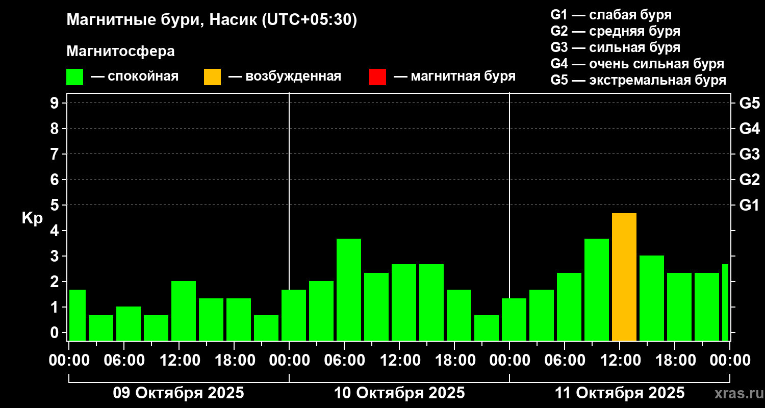 Изменения геомагнитного индекса Kp с 9 по 11 октября 2025 года для средних широт