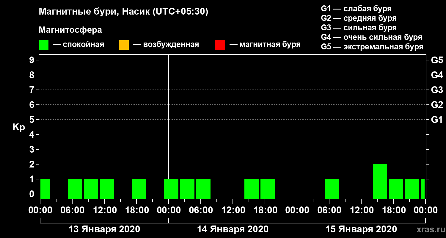 Изменения геомагнитного индекса Kp с 13 по 15 января 2020 года для средних широт