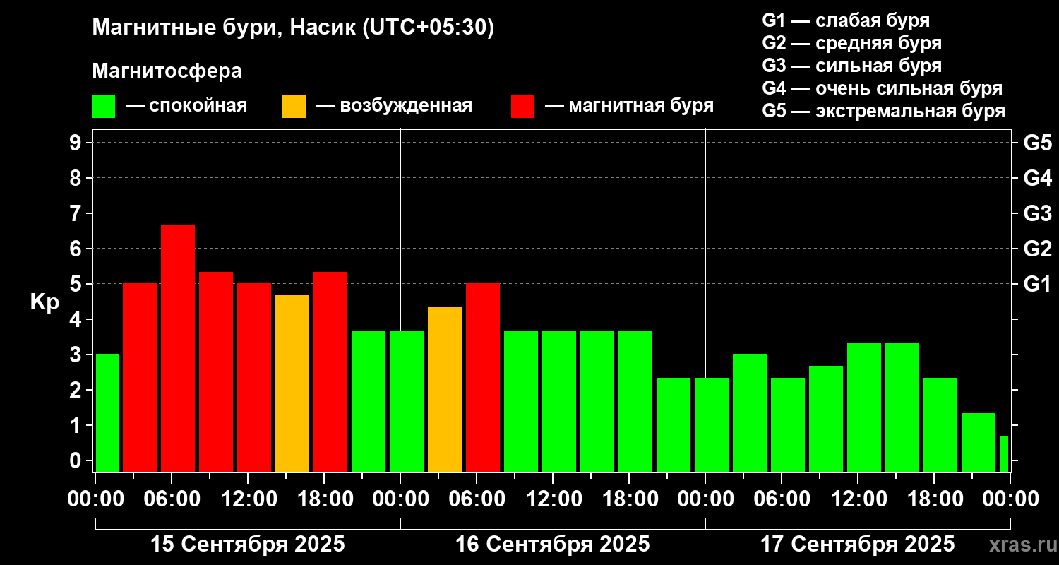 Изменения геомагнитного индекса Kp с 15 по 17 сентября 2025 года для средних широт
