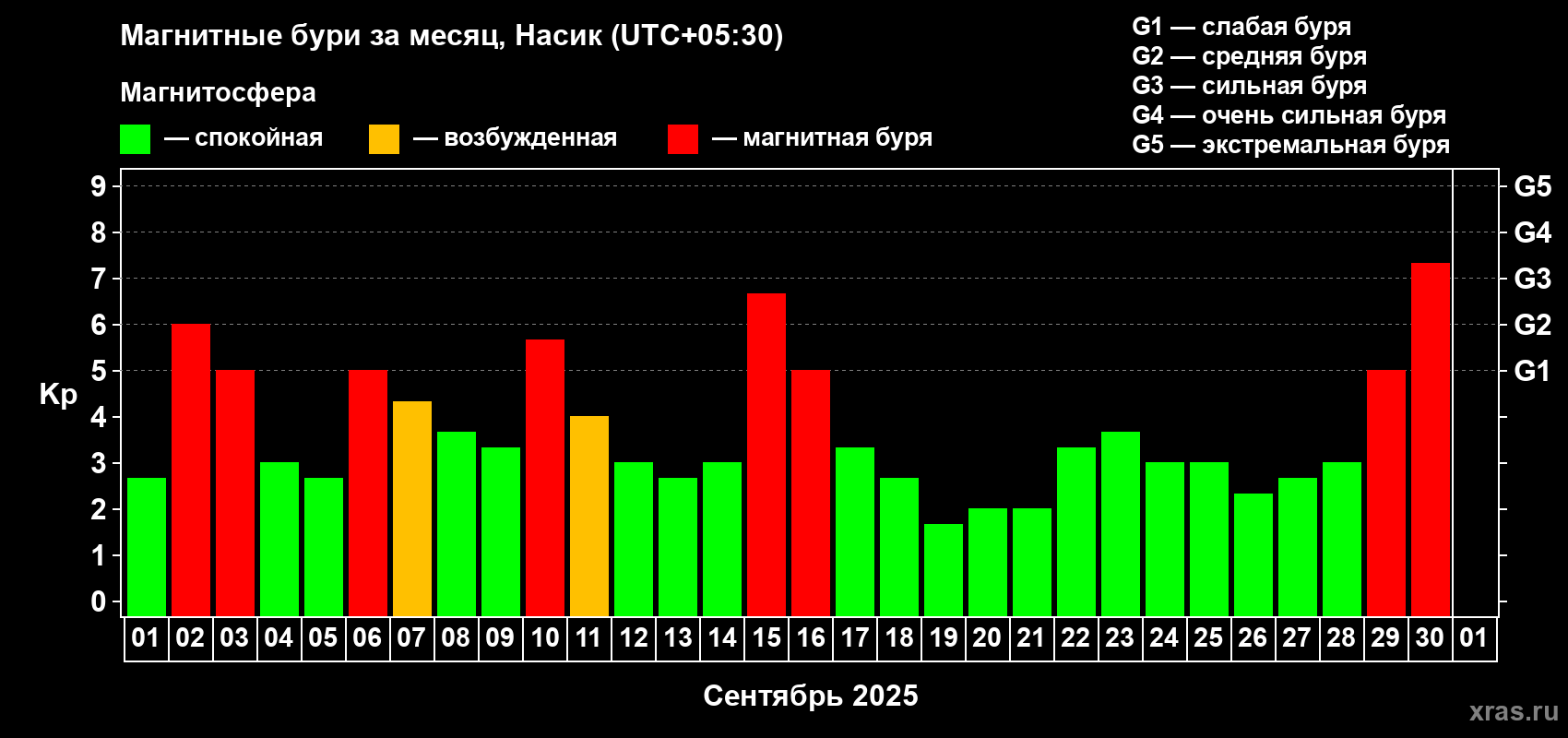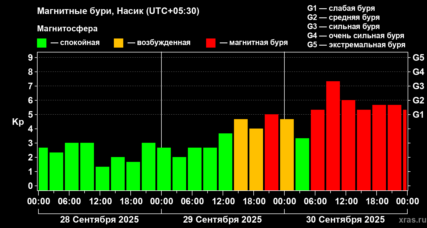 Изменения геомагнитного индекса Kp с 28 по 30 сентября 2025 года для средних широт