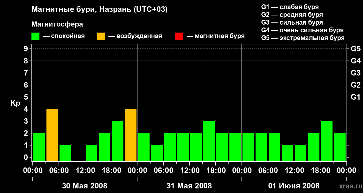 Изменения геомагнитного индекса Kp с 30 мая по 1 июня 2008 года для средних широт
