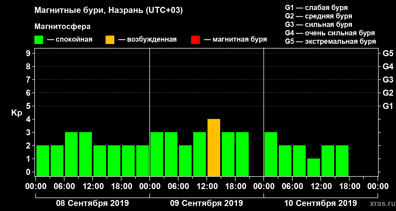 Изменения геомагнитного индекса Kp с 8 по 10 сентября 2019 года для средних широт