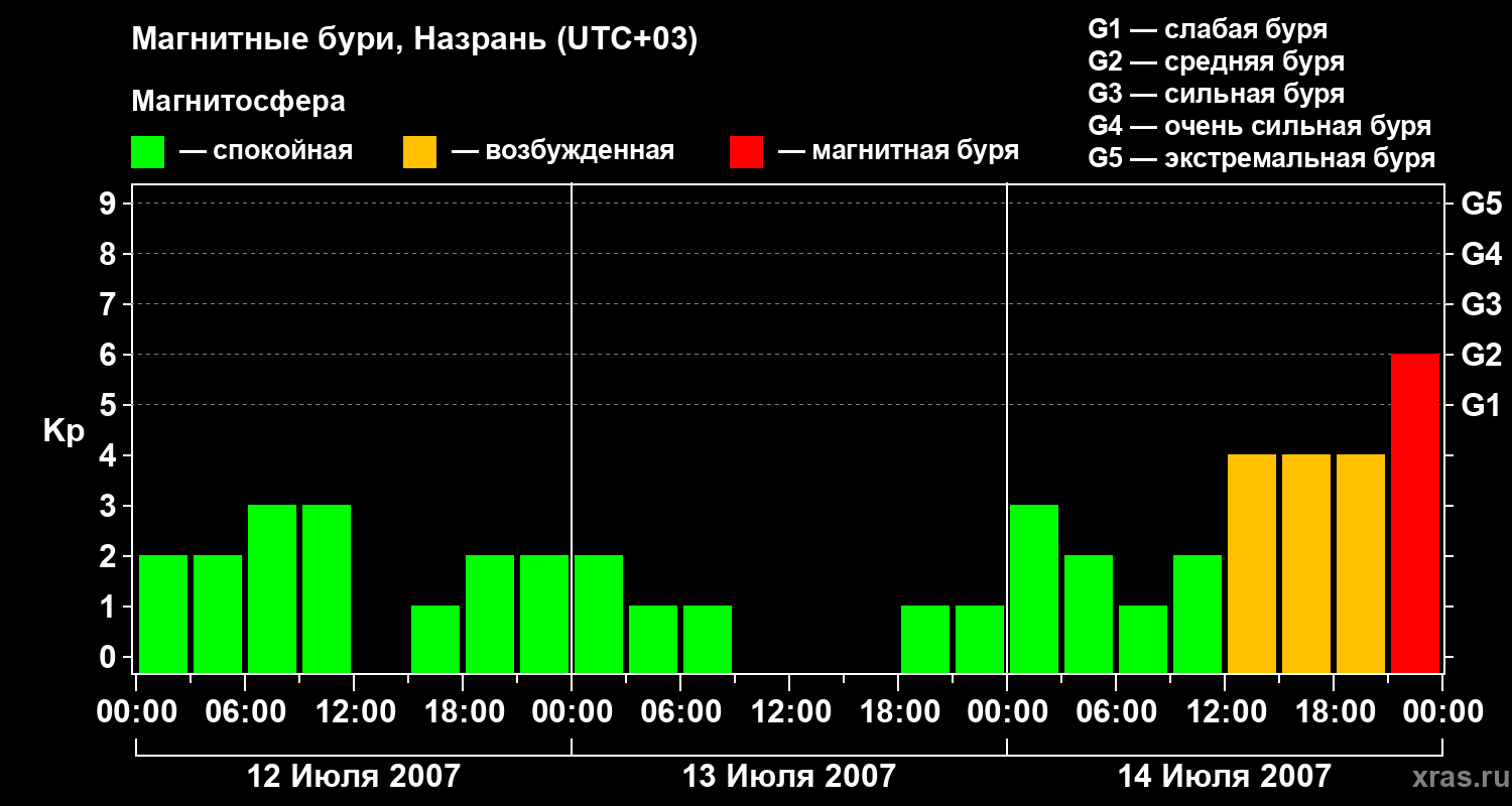 Изменения геомагнитного индекса Kp с 12 по 14 июля 2007 года для средних широт
