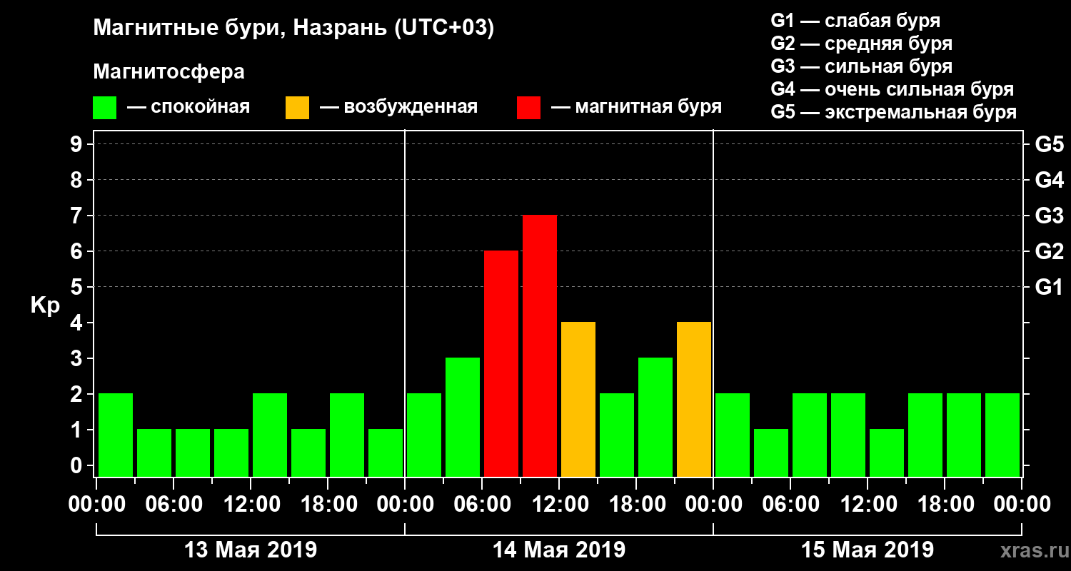 Изменения геомагнитного индекса Kp с 13 по 15 мая 2019 года для средних широт