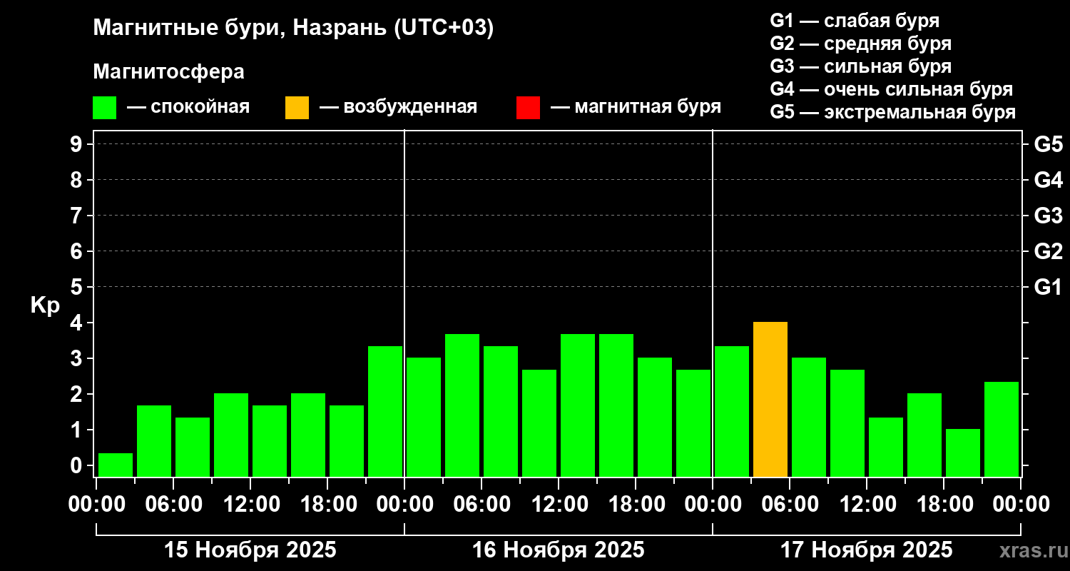Изменения геомагнитного индекса Kp с 15 по 17 ноября 2025 года для средних широт