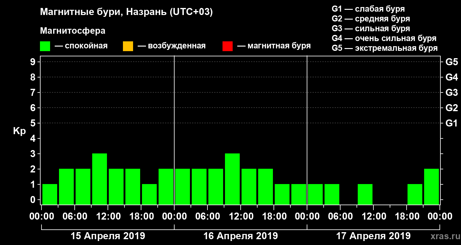 Изменения геомагнитного индекса Kp с 15 по 17 апреля 2019 года для средних широт