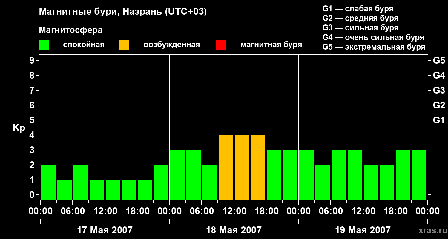 Изменения геомагнитного индекса Kp с 17 по 19 мая 2007 года для средних широт