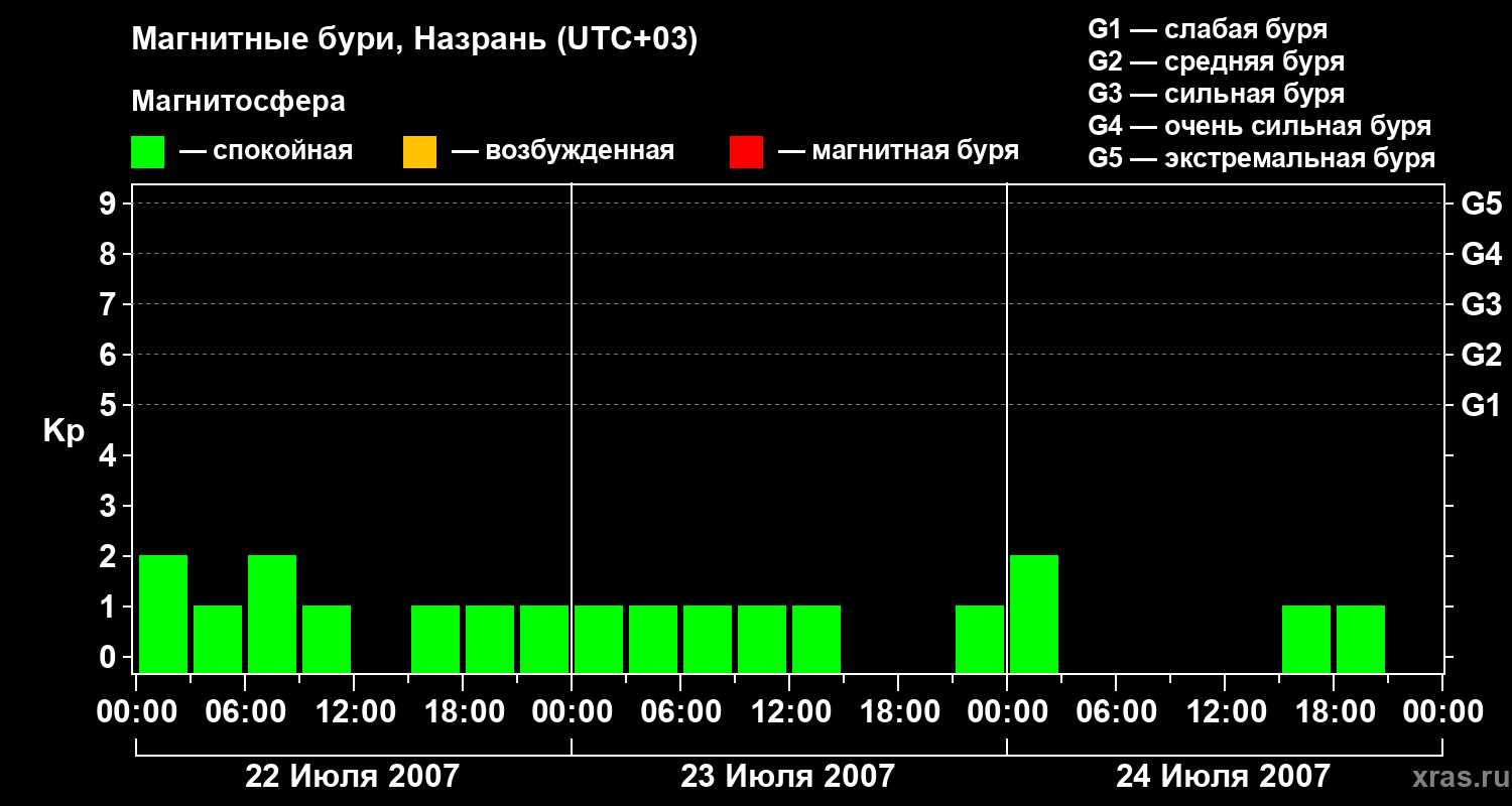Изменения геомагнитного индекса Kp с 22 по 24 июля 2007 года для средних широт