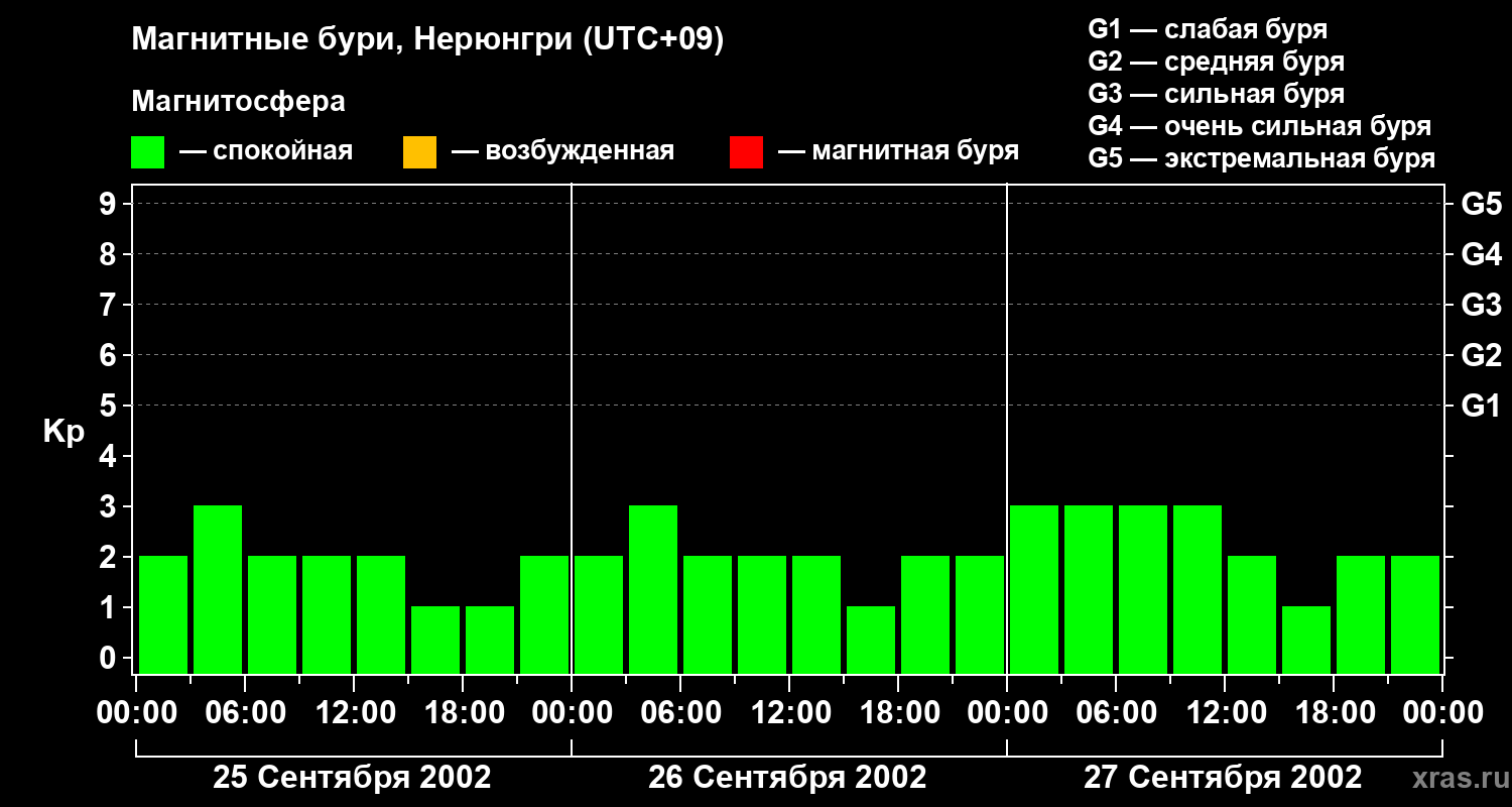 Изменения геомагнитного индекса Kp с 25 по 27 сентября 2002 года для средних широт