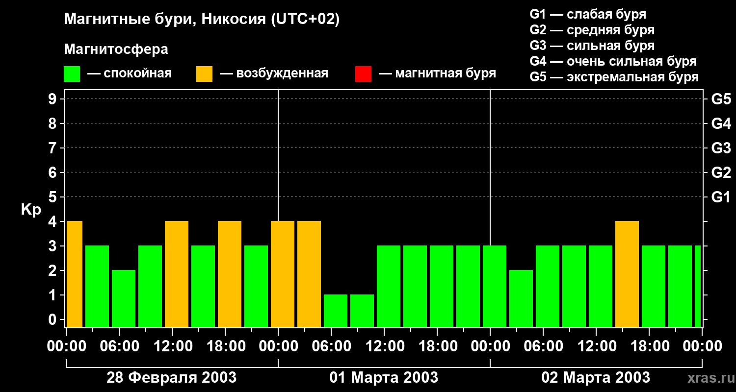 Изменения геомагнитного индекса Kp с 28 февраля по 2 марта 2003 года для средних широт