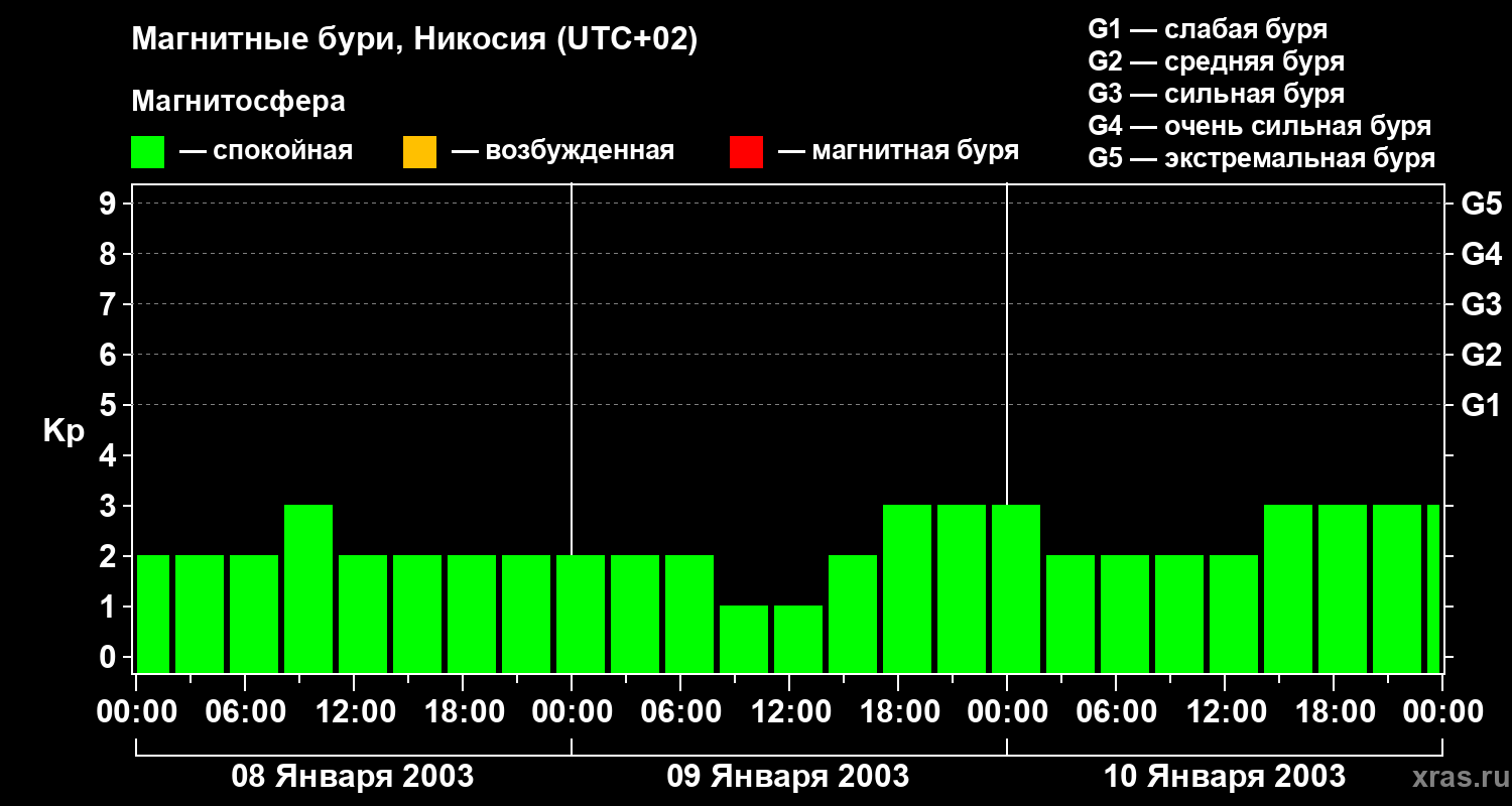 Изменения геомагнитного индекса Kp с 8 по 10 января 2003 года для средних широт