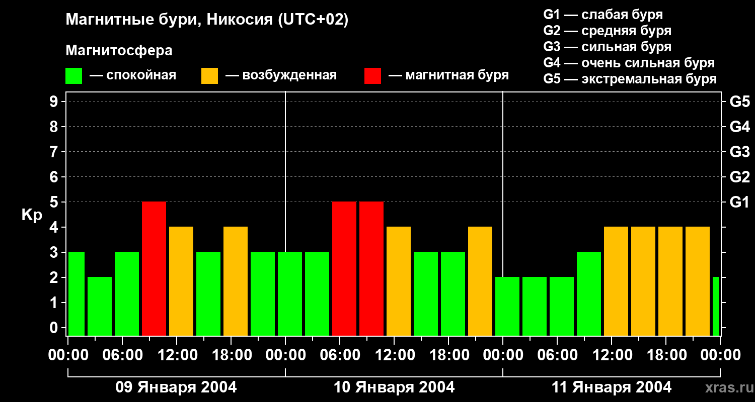 Изменения геомагнитного индекса Kp с 9 по 11 января 2004 года для средних широт