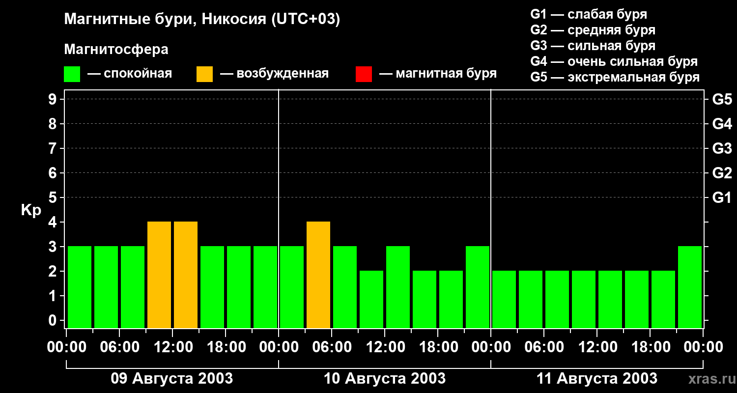Изменения геомагнитного индекса Kp с 9 по 11 августа 2003 года для средних широт