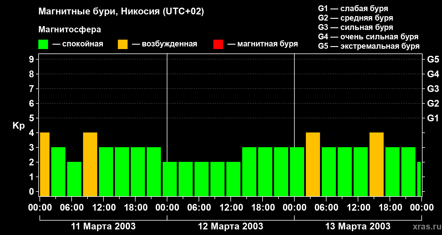 Изменения геомагнитного индекса Kp с 11 по 13 марта 2003 года для средних широт