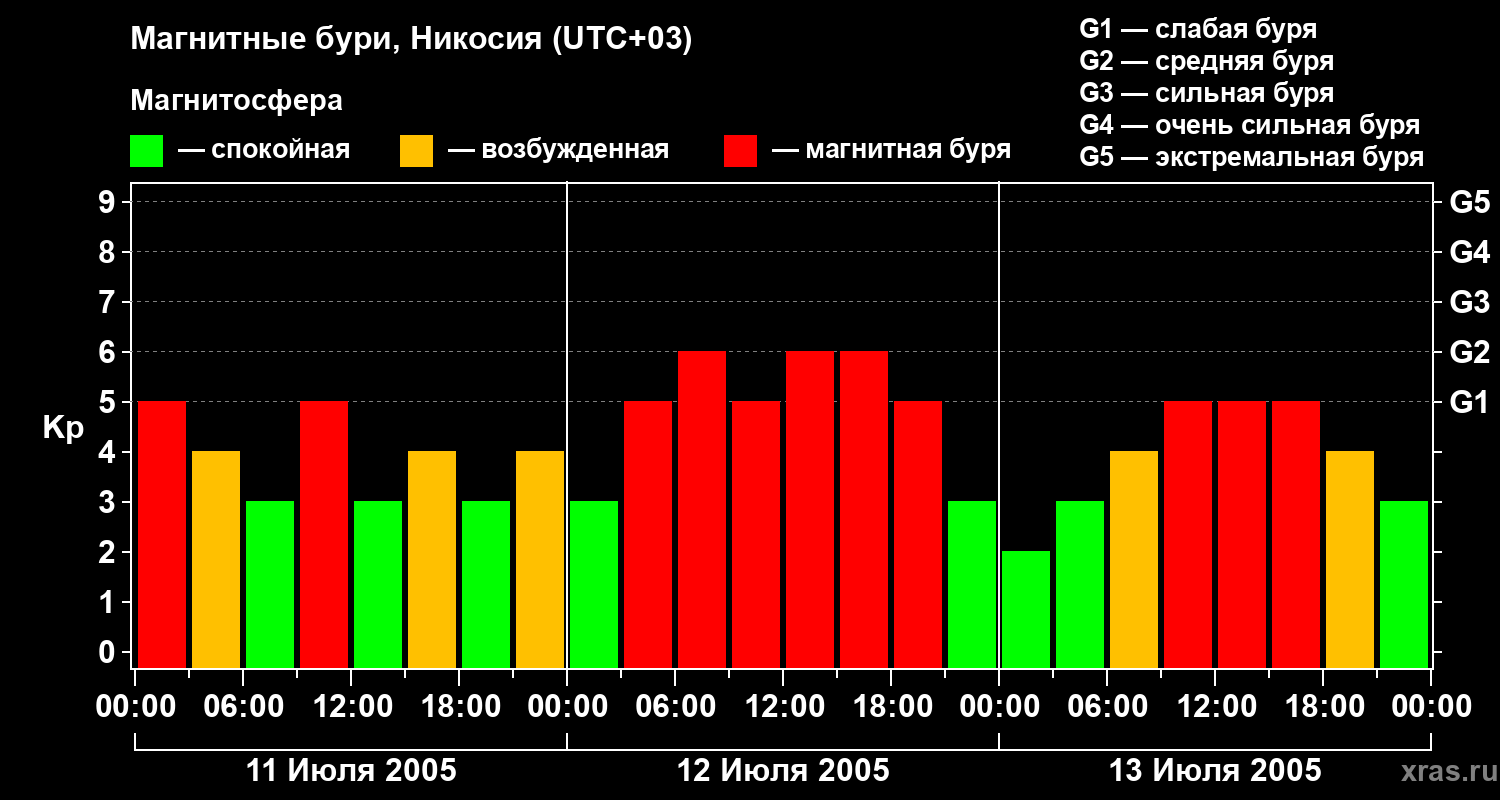 Изменения геомагнитного индекса Kp с 11 по 13 июля 2005 года для средних широт