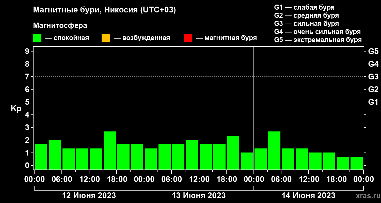 Изменения геомагнитного индекса Kp с 12 по 14 июня 2023 года для средних широт
