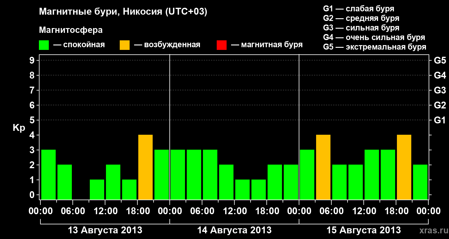 Изменения геомагнитного индекса Kp с 13 по 15 августа 2013 года для средних широт