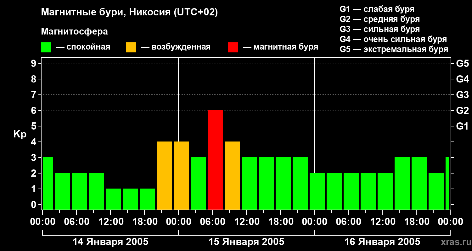 Изменения геомагнитного индекса Kp с 14 по 16 января 2005 года для средних широт