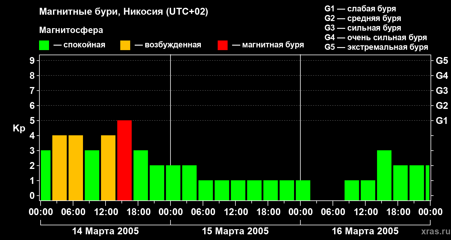 Изменения геомагнитного индекса Kp с 14 по 16 марта 2005 года для средних широт