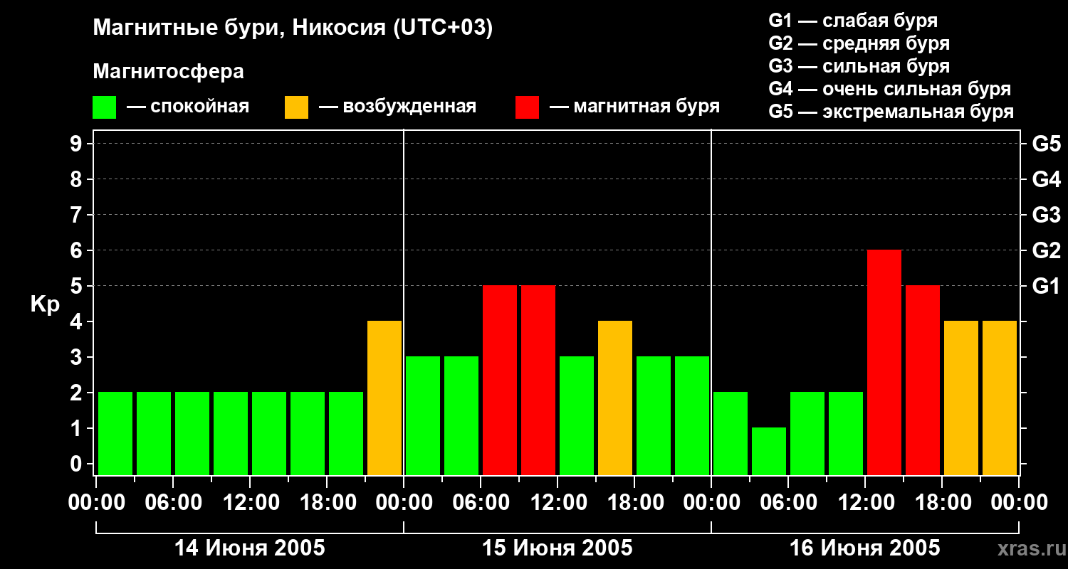 Изменения геомагнитного индекса Kp с 14 по 16 июня 2005 года для средних широт