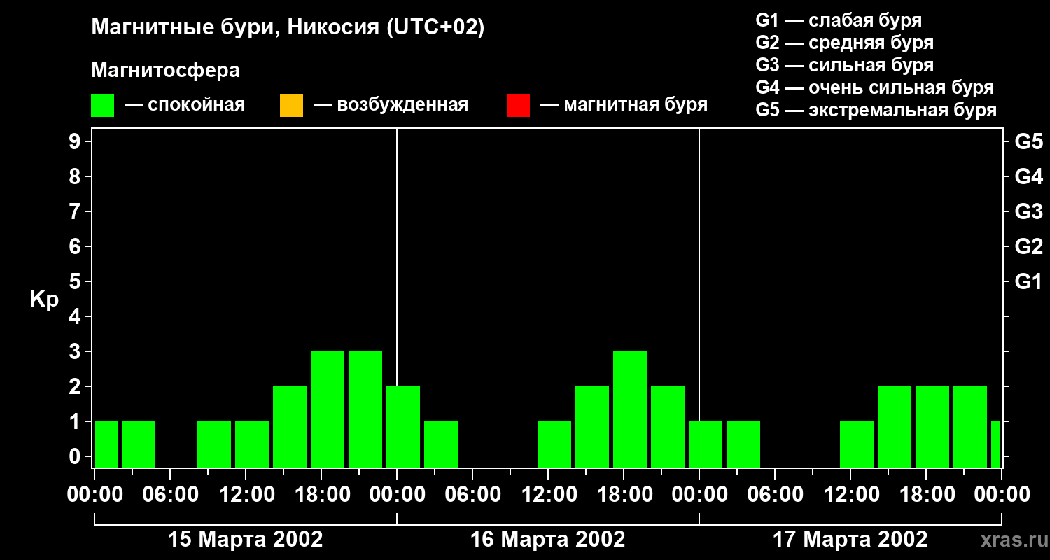 Изменения геомагнитного индекса Kp с 15 по 17 марта 2002 года для средних широт