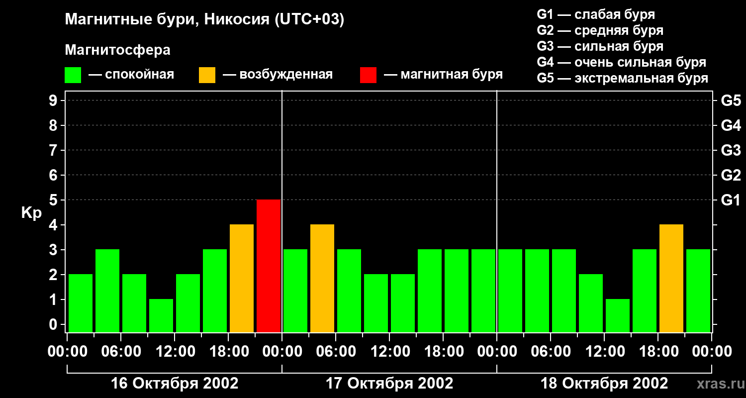 Изменения геомагнитного индекса Kp с 16 по 18 октября 2002 года для средних широт