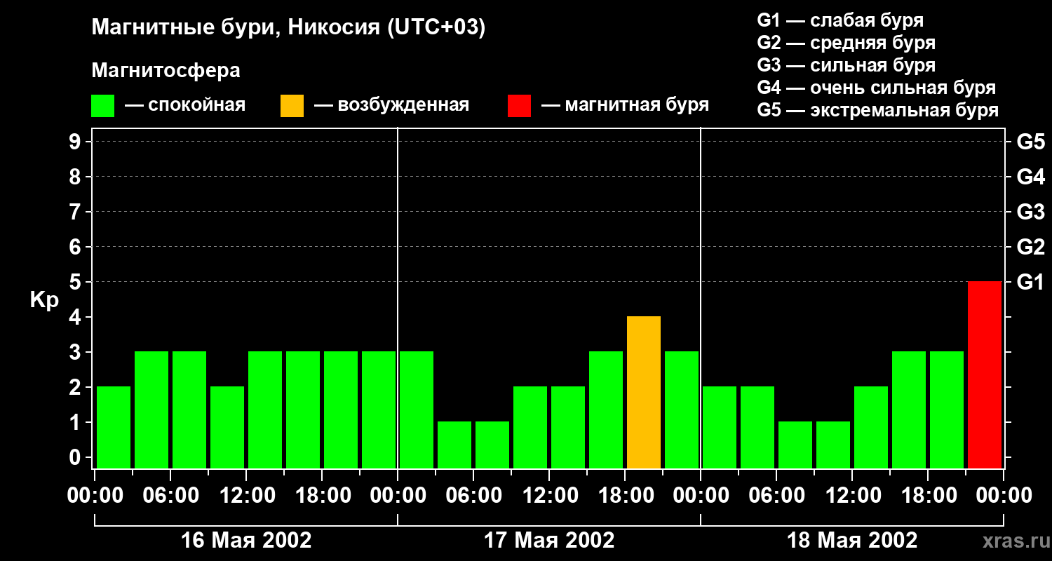 Изменения геомагнитного индекса Kp с 16 по 18 мая 2002 года для средних широт