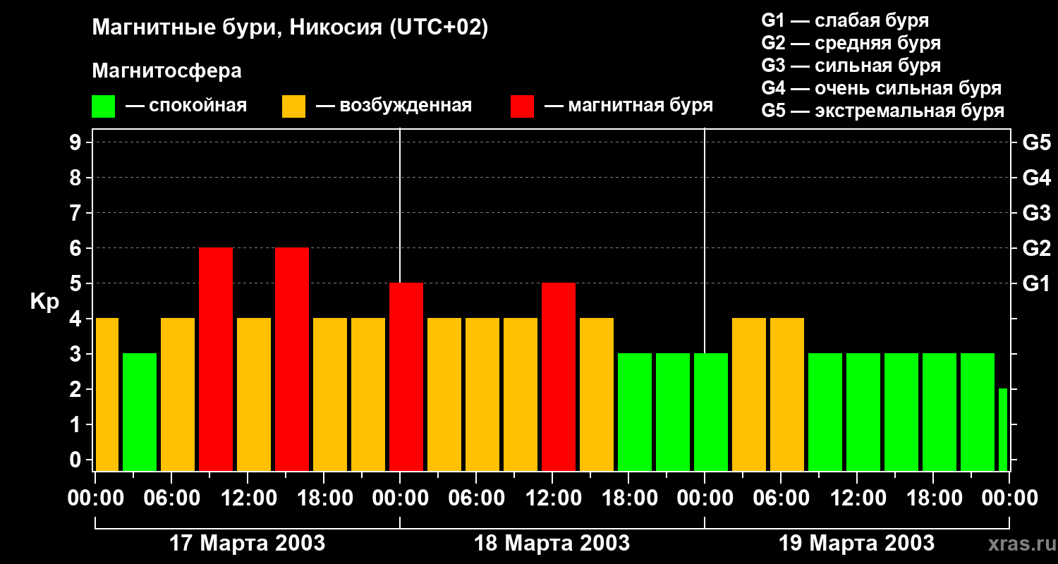 Изменения геомагнитного индекса Kp с 17 по 19 марта 2003 года для средних широт