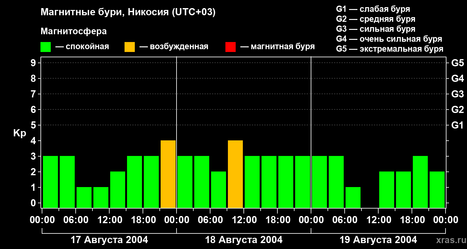 Изменения геомагнитного индекса Kp с 17 по 19 августа 2004 года для средних широт