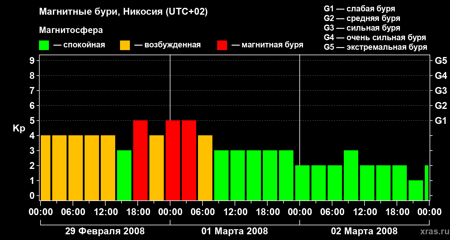 Изменения геомагнитного индекса Kp с 29 февраля по 2 марта 2008 года для средних широт
