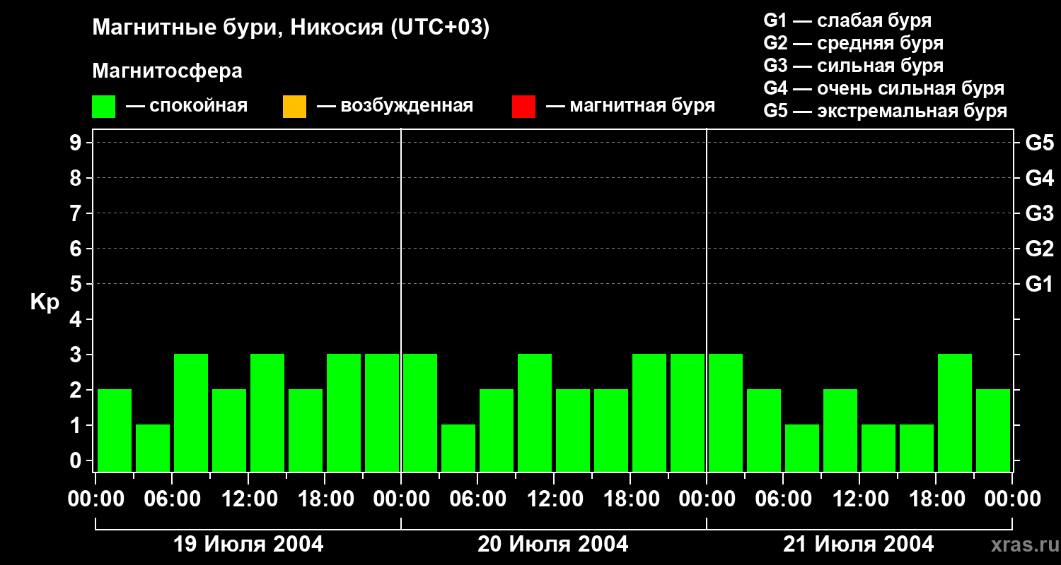 Изменения геомагнитного индекса Kp с 19 по 21 июля 2004 года для средних широт