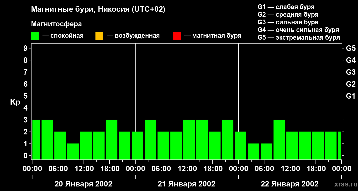 Изменения геомагнитного индекса Kp с 20 по 22 января 2002 года для средних широт