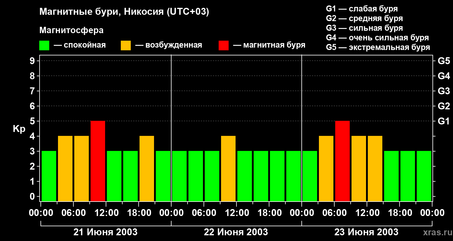 Изменения геомагнитного индекса Kp с 21 по 23 июня 2003 года для средних широт