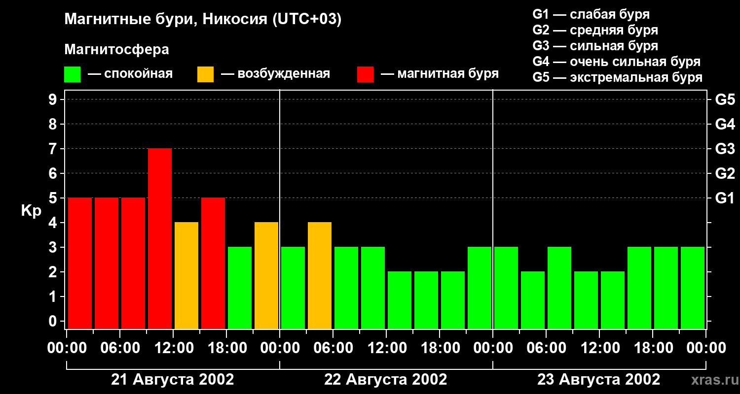 Изменения геомагнитного индекса Kp с 21 по 23 августа 2002 года для средних широт