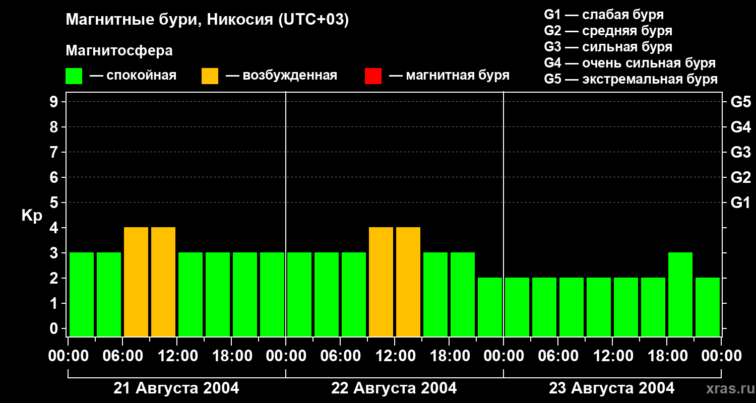 Изменения геомагнитного индекса Kp с 21 по 23 августа 2004 года для средних широт