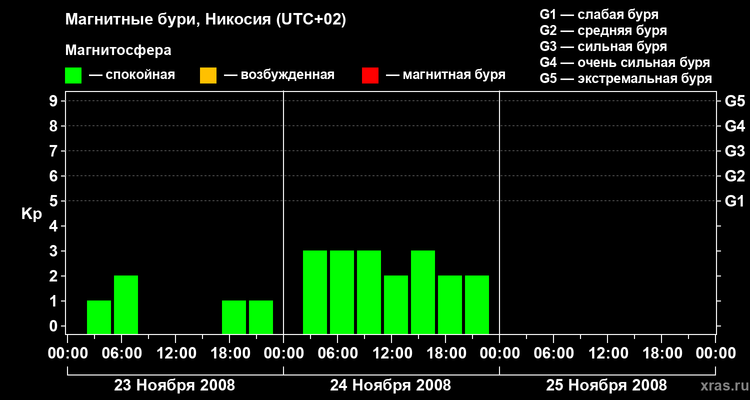 Изменения геомагнитного индекса Kp с 23 по 25 ноября 2008 года для средних широт