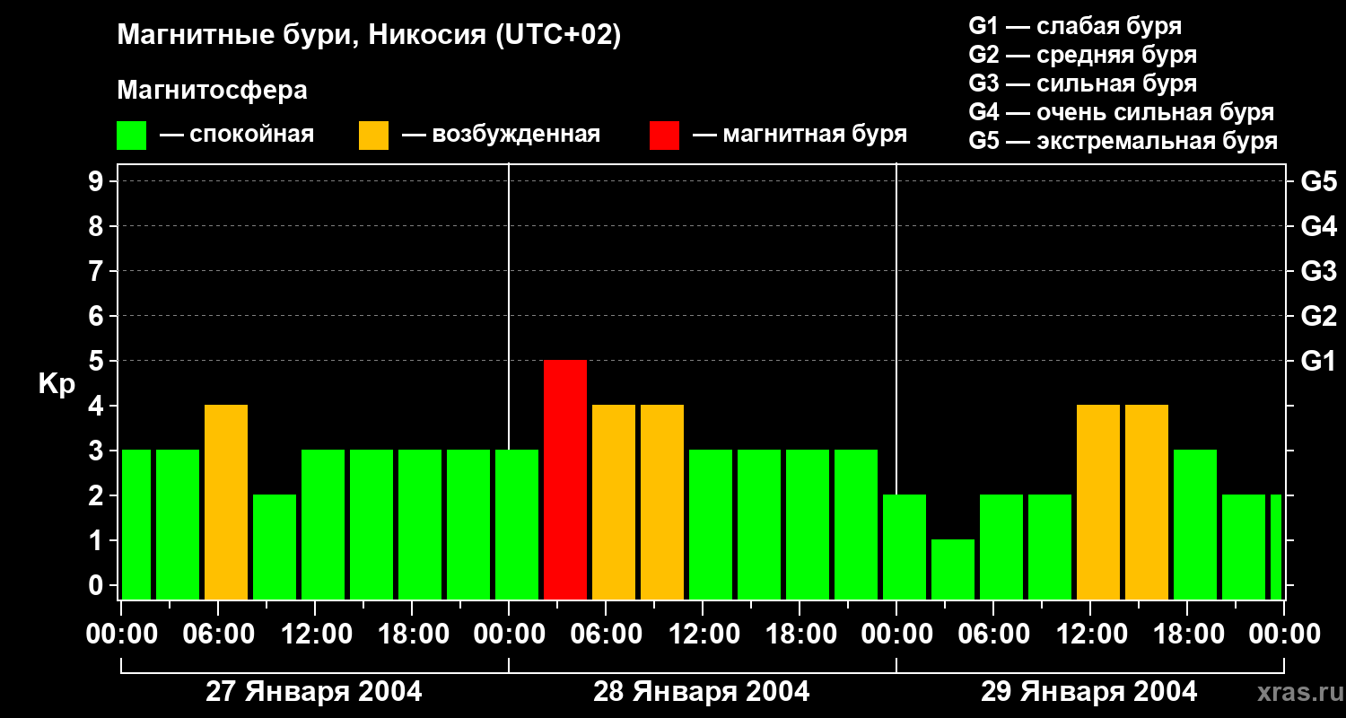 Изменения геомагнитного индекса Kp с 27 по 29 января 2004 года для средних широт