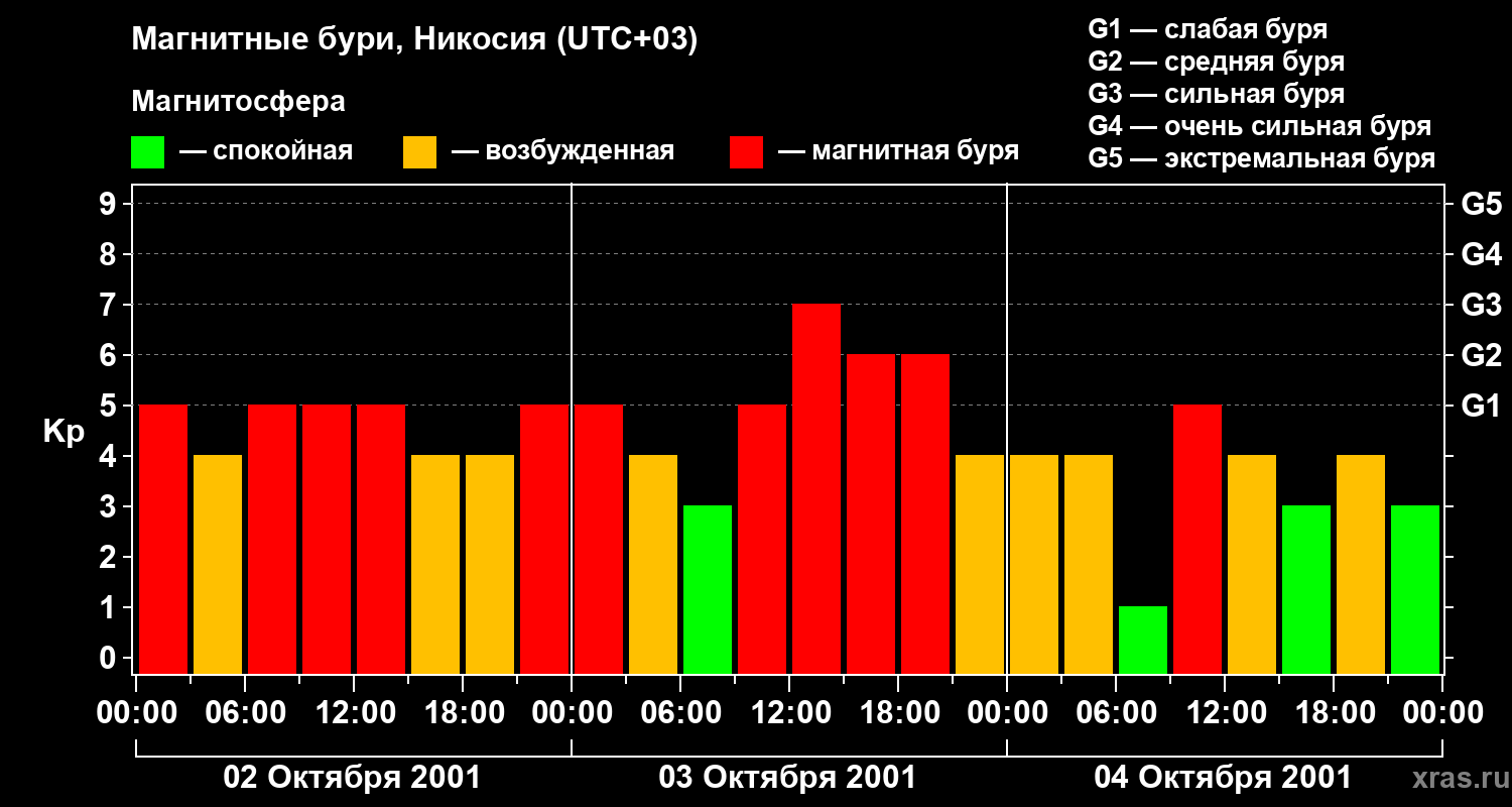 Изменения геомагнитного индекса Kp с 2 по 4 октября 2001 года для средних широт
