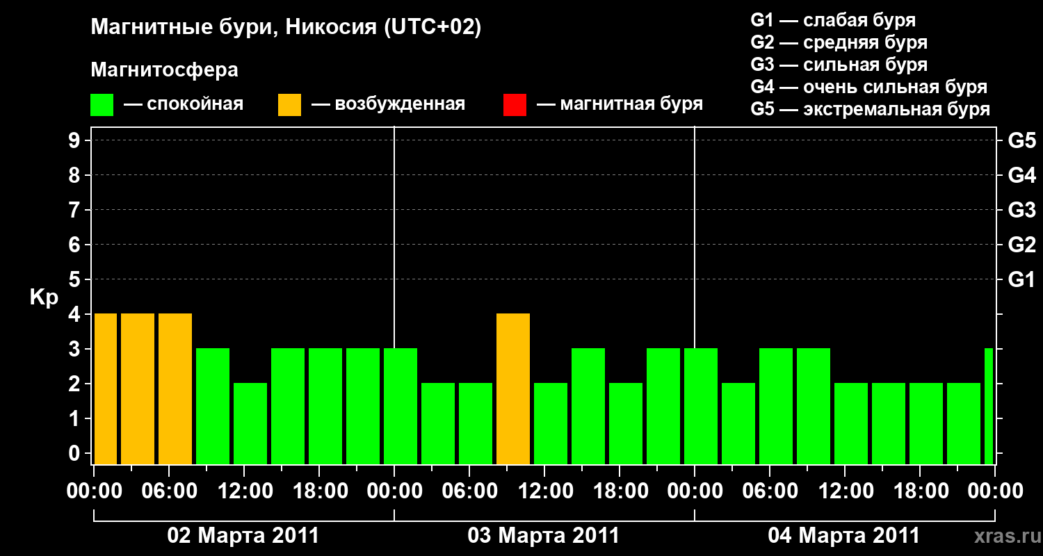 Изменения геомагнитного индекса Kp с 2 по 4 марта 2011 года для средних широт