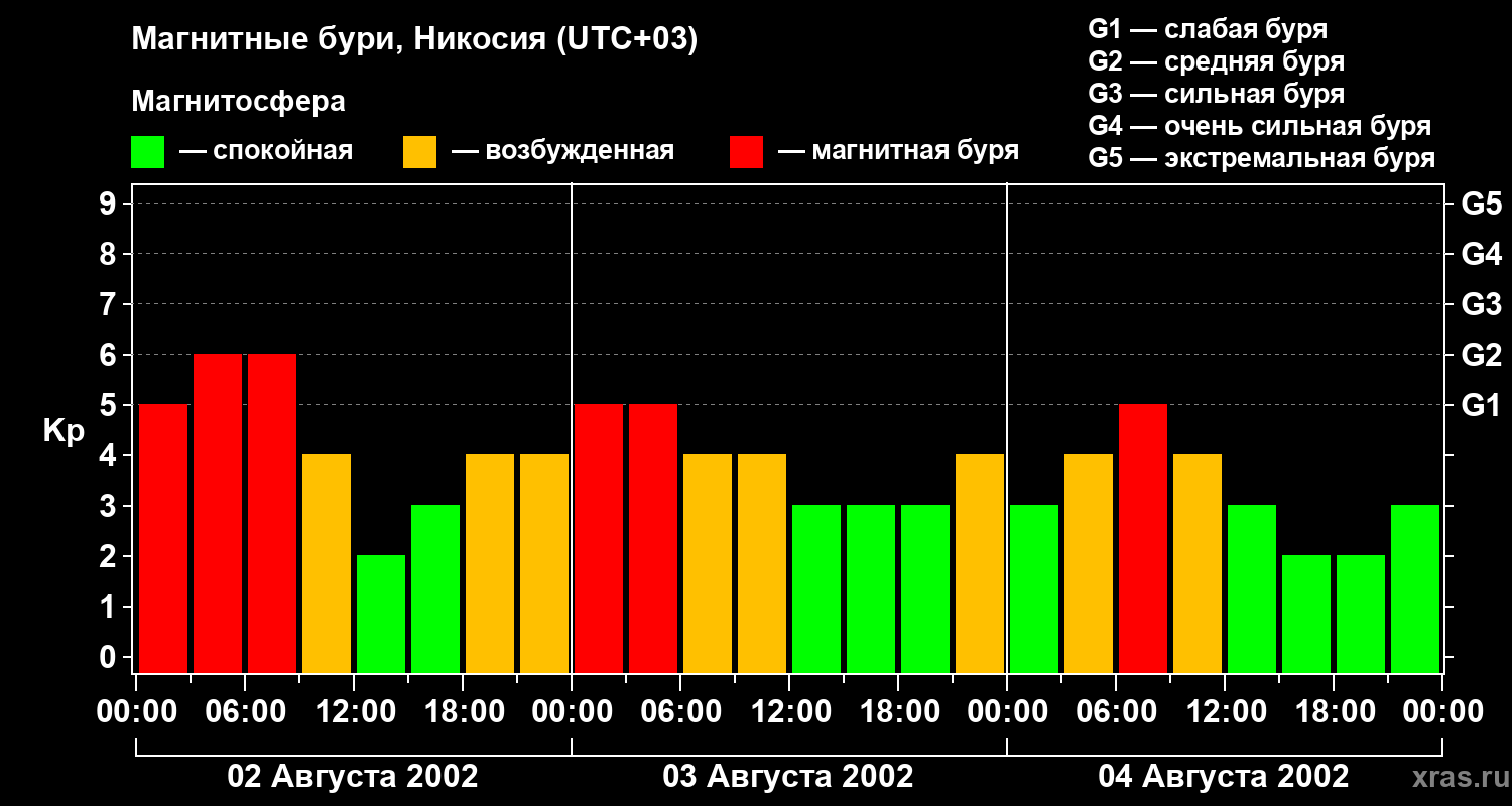 Изменения геомагнитного индекса Kp с 2 по 4 августа 2002 года для средних широт