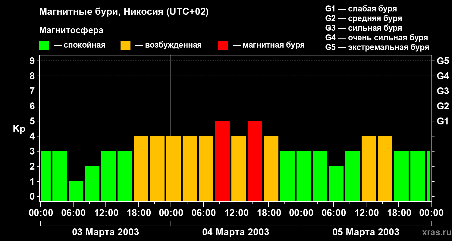 Изменения геомагнитного индекса Kp с 3 по 5 марта 2003 года для средних широт