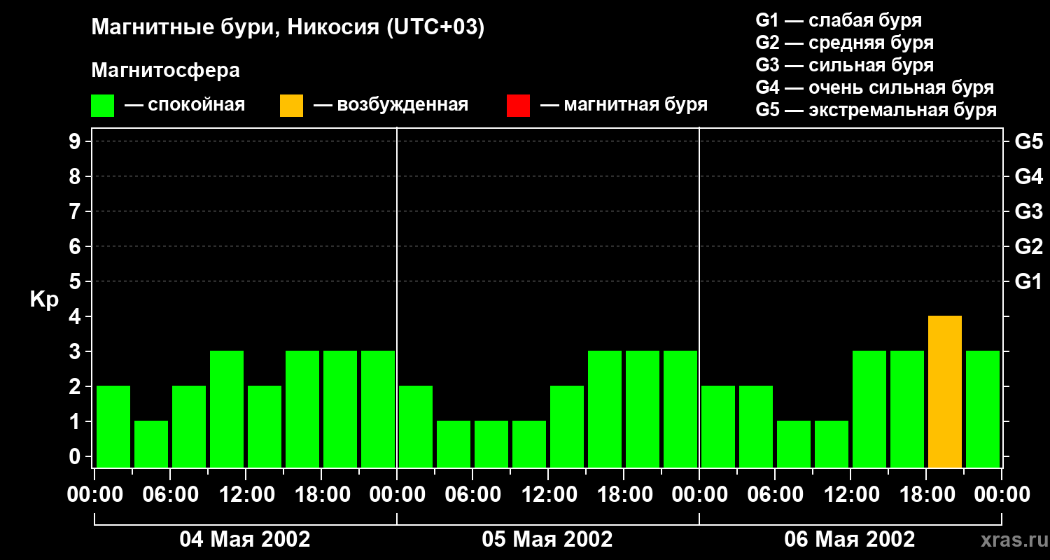 Изменения геомагнитного индекса Kp с 4 по 6 мая 2002 года для средних широт