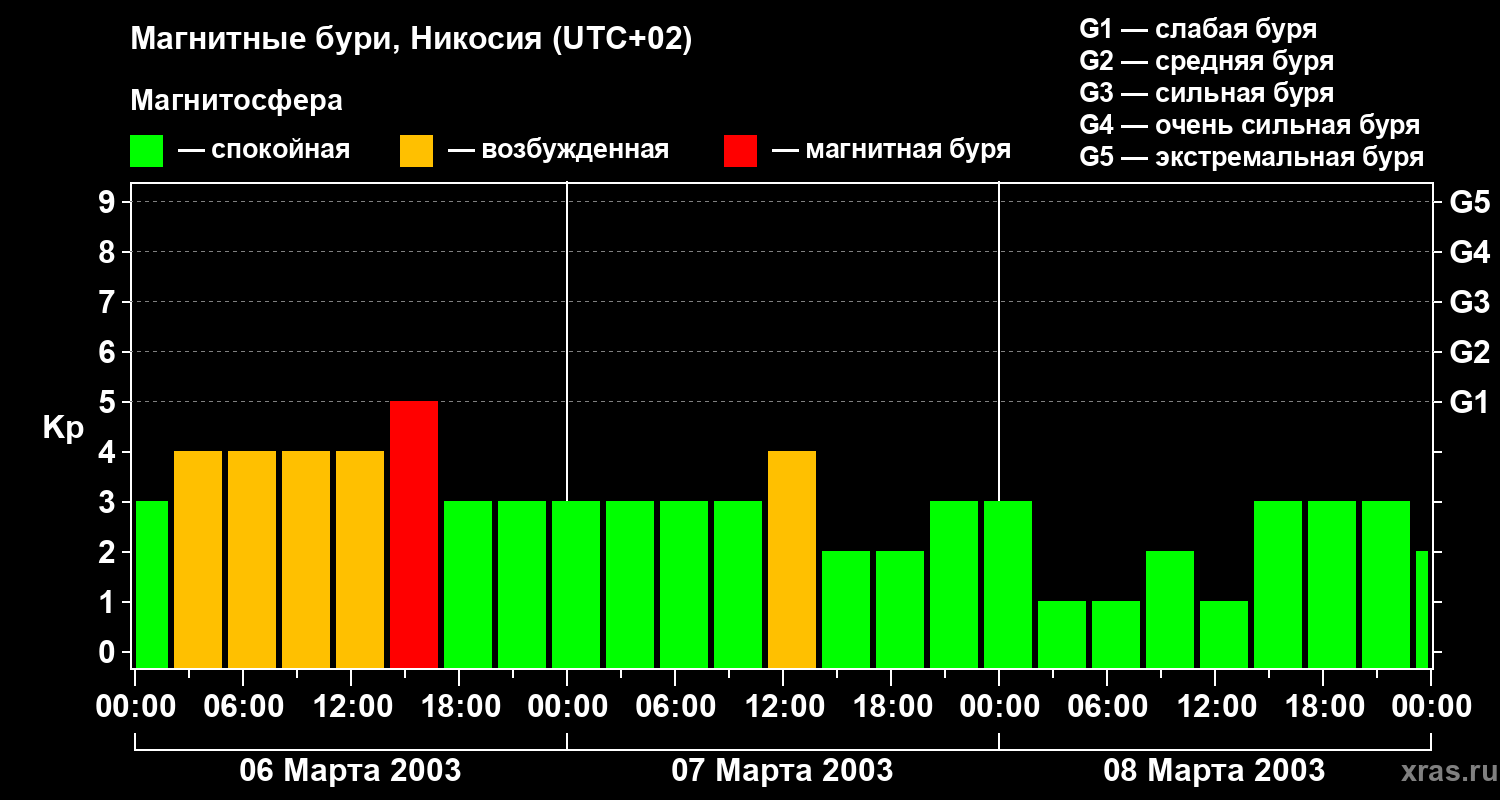 Изменения геомагнитного индекса Kp с 6 по 8 марта 2003 года для средних широт